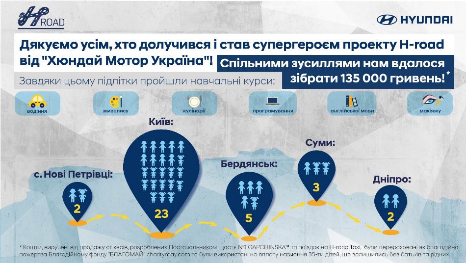 В рамках соціального проекту H-Road було зібрано 135 000 гривень, які було спрямовано на навчання 35 дітей-сиріт по усій Україні за такими напрямами: IT-сфера, водіння, англійська мова, живопис, відео та монтаж, а також кулінарія.