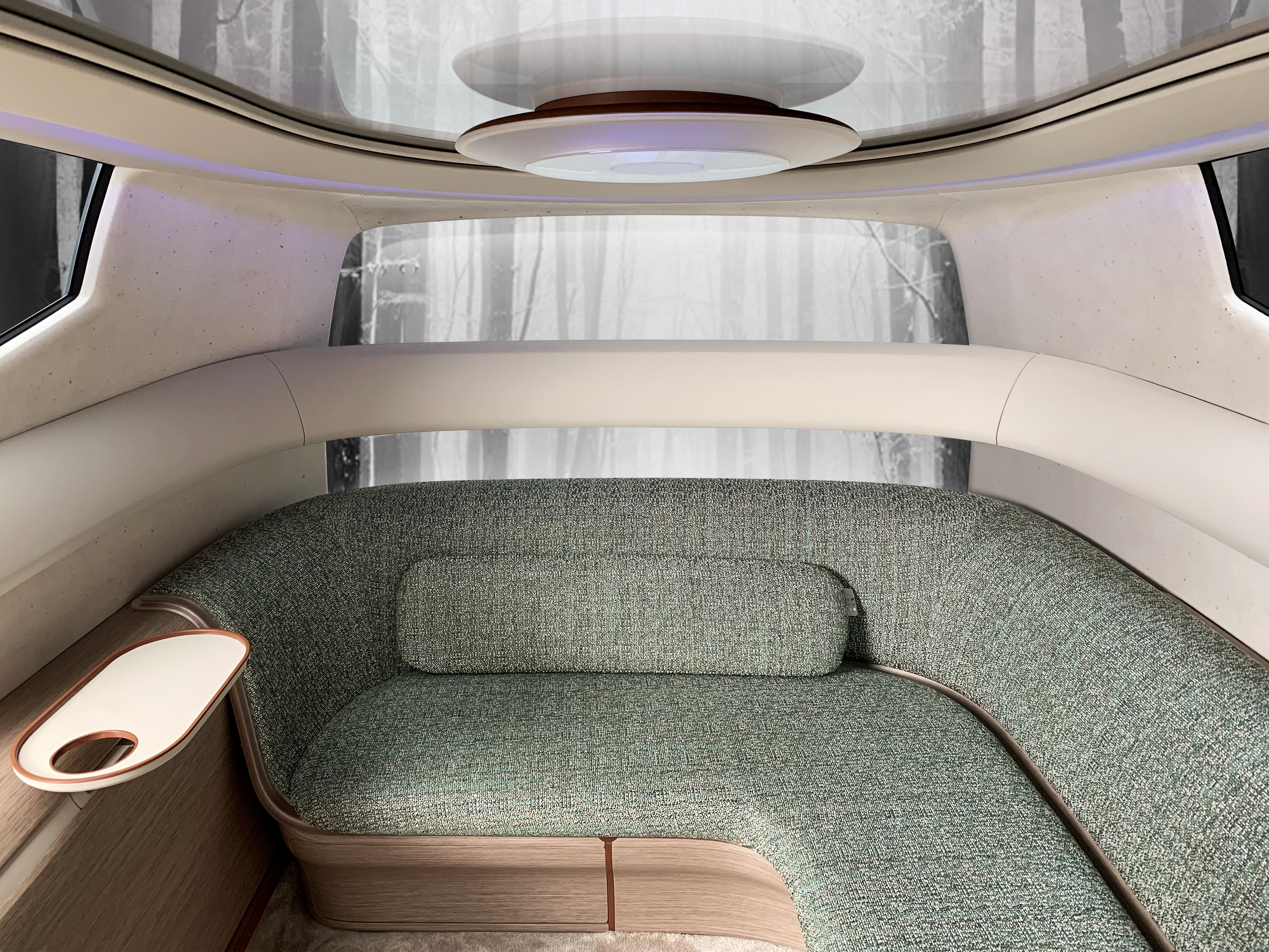 У дах автомобіля вбудований панорамний дисплей, який не тільки транслює різноманітний контент відповідно до вподобань пасажирів, але й змінює загальну атмосферу інтер'єру, забезпечуючи високий рівень розслаблення та задоволення під час подорожі.